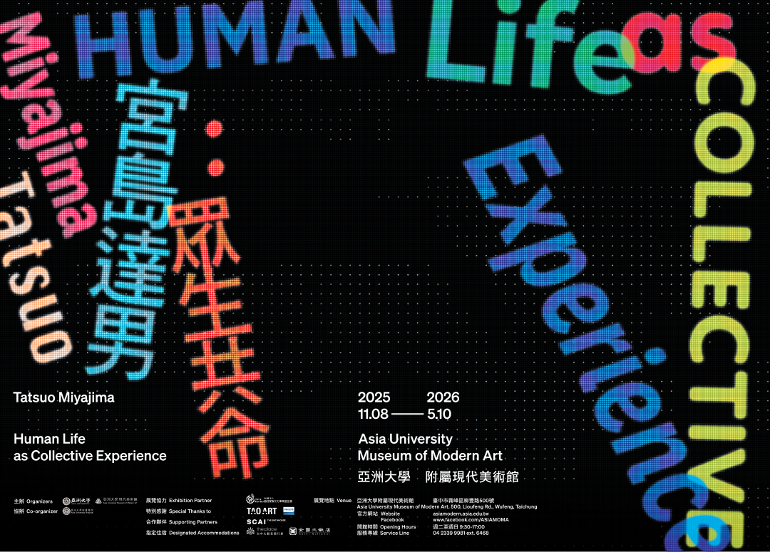 “Human Life as Collective Experience” is Tatsuo Miyajima’s first solo museum exhibition in Taiwan, featuring the artist’s classical works from 1993 to 2025, newly created artworks, as well as rarely-seen concept drawings for creative projects and performance art. The numbers in the exhibition, coming from various cultures and languages, are imbued with distinct speed, tone, or color, symbolizing the state of collective existence of numerous individuals around the world, intertwining and coexisting in communities. This exhibition featuring oeuvre spanning over three decades is not a static retrospective. Instead, it is a solo exhibition involving different stages of participation and journeys of co-creation, engaging in an intimate dialogue with the local context. With five collaborative works produced with participants from Taiwan, Wufeng, and the China Medical University - Asia University System, what the artist seeks through the exhibition is to reflect that we are more than individuals, rather a collective with everyone involved and interdependent on each other.